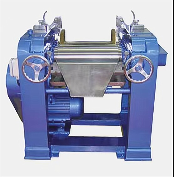 三輥研磨機適用膏體或高粘度物料使用。該機通過水平的三根輥筒的表面相互擠壓,手動式調節輥筒之間的間距,以不同速度的摩擦達到研磨效果。可裝有緊急制動按鈕,防止落入異物導致的設備損壞。輥子使用特殊硬質合金澆鑄而成;也可以使用大理石材質。傳動采用鏈條傳動、齒輪調輥。